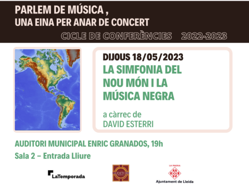 Dijous, 18 de maig, a les 19h, David Esterri, músic, compositor i pedagog, ens parlarà de "La Simfonia del nou món i la música negra" darrera conferència del cicle PARLEM DE MÚSICA, UNA EINA PER ANAR DE CONCERT