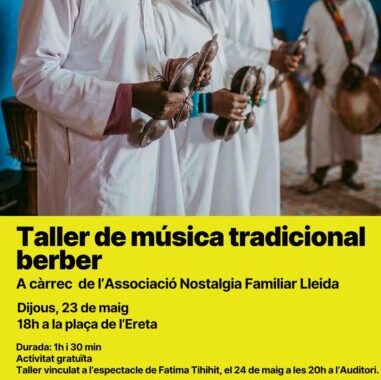 Taller introductori de diferents instruments musicals típics de la cultura berber marroquina: hejehoj, krakeb i violí. Els tres músics berbers que acompanyen Fatima Tihihit en el concert que tindrà lloc a l'Auditori el divendres 24 de maig, ens ensenyaran els instruments, els tocaran i ens mostraran les característiques més importants d’aquest tipus de música. També ens acompanyarà el grup lleidatà d’origen amazic, Deka jawaher Lleida, de l’Associació Nostàlgia Lleida
