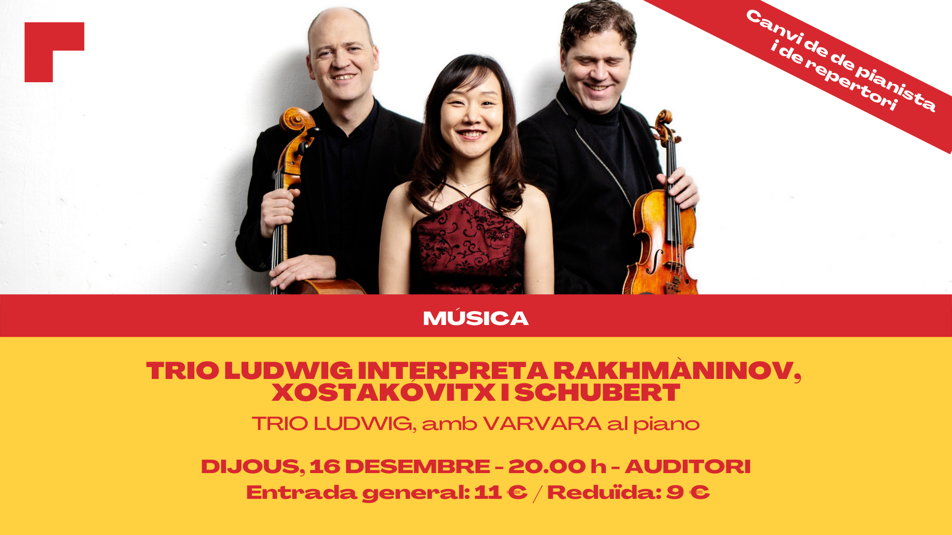 Abel Tomàs Realp, violín Arnau Tomàs Realp, violonchelo Varvara, piano  Considerado como una de las formaciones más destacadas de la actualidad, el Trío Ludwig tiene como vocación principal profundizar en la obra de Beethoven. Formado por los hermanos Abel y Arnau Tomàs al violín y al violonchelo, respectivamente, fundadores y miembros del reconocido Cuarteto Casals, y en esta ocasión tocaran acompañados de la pianista rusa Varvara. En este concierto el Trío Ludwig nos propone un programa configurado por obras de Rachmaninov, Shostakovich y Schubert.   Programa   Trio élégiaque número 1, en sol menor                          S. Rachmaninoff Trío nº2 en mi menor, op.67                                           D. Shostakovich Trío para piano núm. 2, en mi bemol mayor, D. 929    F. Schubert